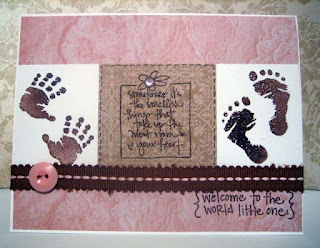Here's the sketch and my card: Isn't that a great sketch?! I LOVE clean lines and this sketch was perfect! I had just bought some $1 stamps from Jo-Anns Fabric that were little feet and little hands and I knew I could put those on the sides of the card with the cute "poem" in the center. I chose to emboss the little feet and hands and all the writing. Then I just added the ribbon and a pink gem and done! I love sketches that are easy and that you can tailor to so many different occasions. I know I'll be using this one for many different types of cards!